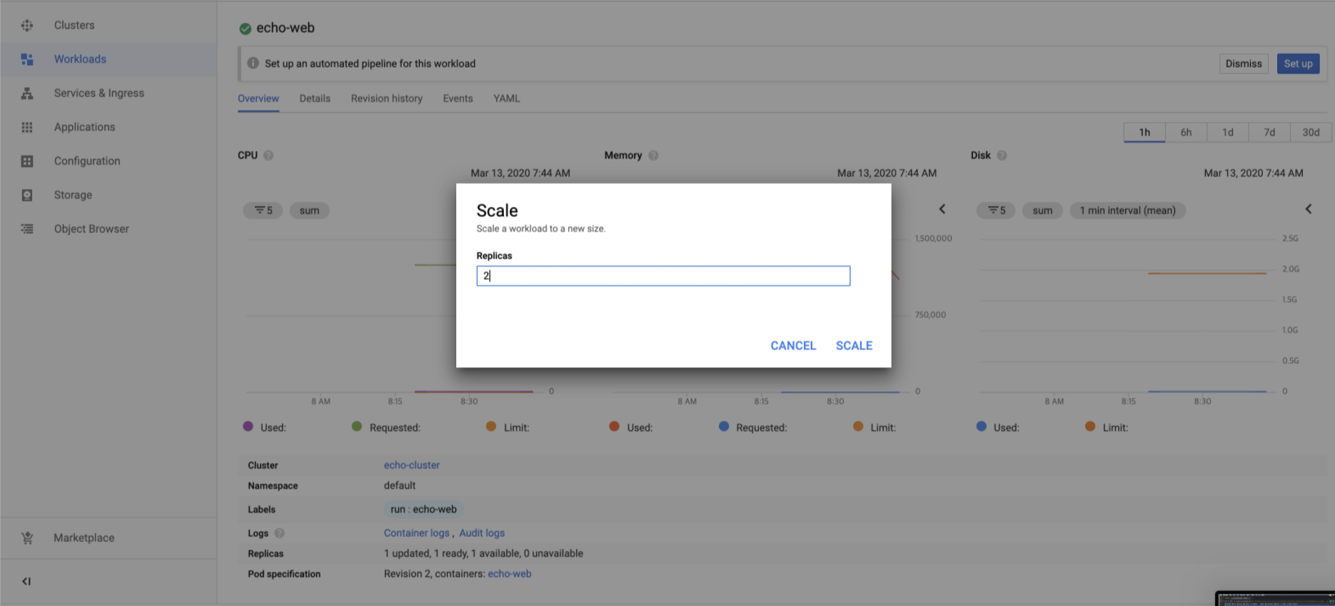Action 메뉴에서 Scale 을 클릭한후 Replicas 값을 2 로 입력한다.