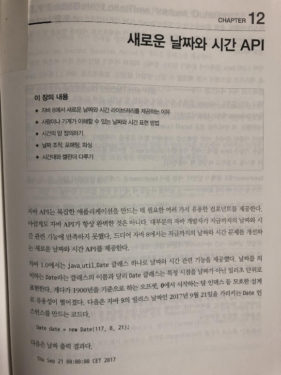 날짜 부분도 내가 관심있어 하는 부분이었다. 로컬타임, UTC, 타임존, 썸머타임 등등. 그런데 날짜 관련 해서는 사용 예 보다는 메서드 위주로 설명이 되어 있어서 약간 아쉬웠다. 아마도 최근에 날짜나 시간 관련해서 사용할 일들이 많아져서 개념과 함께 예들을 많이 보면 좋겠다라는 생각이 든것 같다.