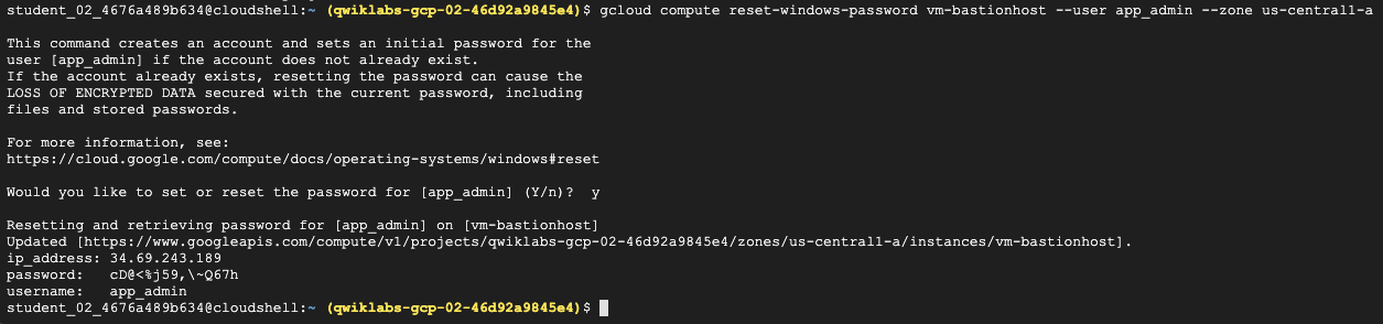 gcloud beta compute --project=qwiklabs-gcp-02-46d92a9845e4 instances create vm-bastionhost --zone=us-central1-a --machine-type=n1-standard-2 --subnet=securenetwork --network-tier=PREMIUM --maintenance-policy=MIGRATE --service-account=365821737857-compute@developer.gserviceaccount.com --scopes=https://www.googleapis.com/auth/devstorage.read_only,https://www.googleapis.com/auth/logging.write,https://www.googleapis.com/auth/monitoring.write,https://www.googleapis.com/auth/servicecontrol,https://www.googleapis.com/auth/service.management.readonly,https://www.googleapis.com/auth/trace.append --tags=rdp --image=windows-server-2016-dc-v20200211 --image-project=windows-cloud --boot-disk-size=50GB --boot-disk-type=pd-standard --boot-disk-device-name=vm-bastionhost --reservation-affinity=any
