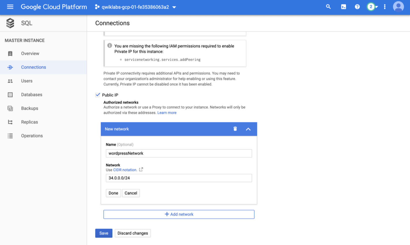 Check that the blog instance is authorized to access Cloud SQL