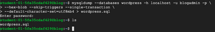 The existing MySQL database is called wordpress and the user called blogadmin with password Password1*, which provides full access to that database.