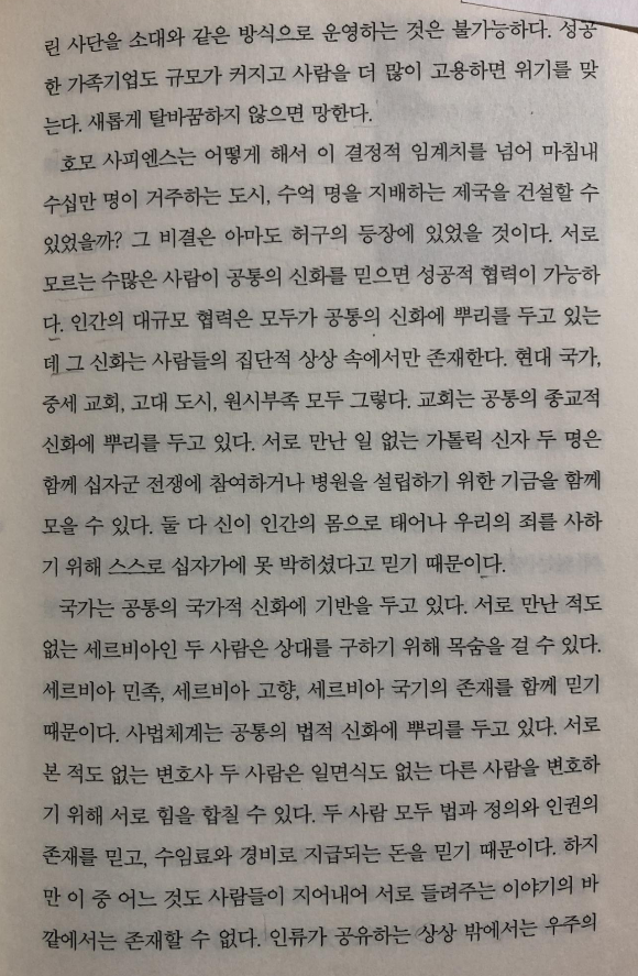 우리 인류가 이렇게 발전하기 전까지 호모 사피엔스 이외에 다른 종들도 있었다. 하지만 지금의 우리가 있을 수 있었던 것, 우리가 이렇게 사회를 구성하고 발전하게 만들 수 있었던 원동력은 허구라는 믿음이 있었기 때문이다. 소규모의 집단이 대규모의 집단으로 커지면서 공통된 무엇인가가 필요했다. 그래서 신화와 같은 허구를 통해 하나로 뭉칠수 있었다. 그리고 협력이라는 상호 작용을 통해서 집단이 커졌을 때에 발생할 수 있던 상황들을 슬기롭게 해결해 나갈수 있었다. 그렇지 않은 집단은 결국 도태되고 또는 사피엔스에 의해서 멸망을 하게 되었다.