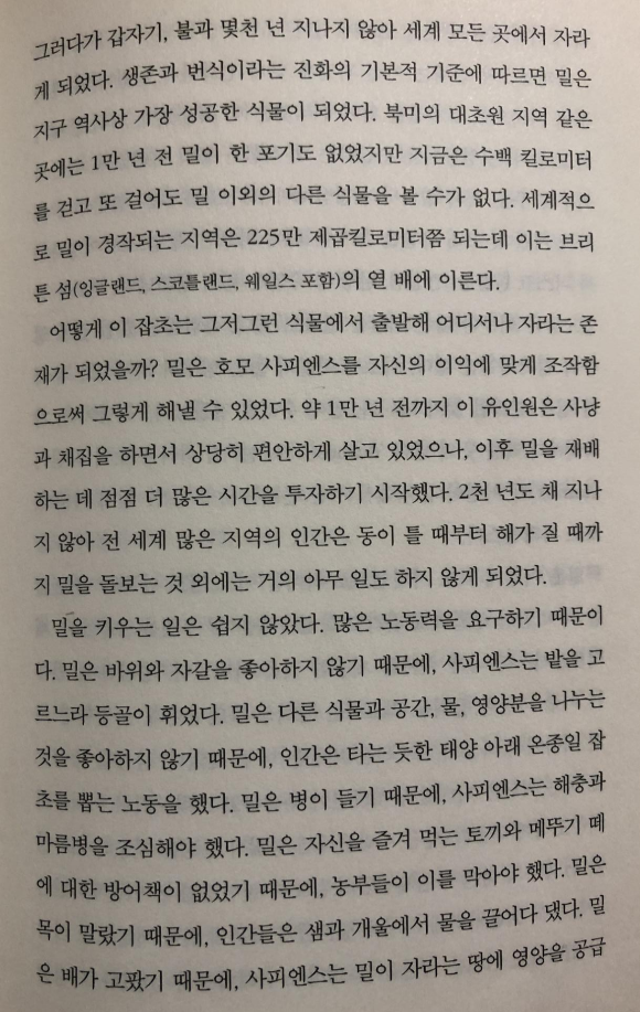 인류는 농업혁명을 통해서 많은 발전을 이루었다고 역사교과서를 통해서 배웠었다. 하지만 이 책에서는 그 농업 혁명이 과연 좋은 방향으로의 발전을 이끌어냈나 라는 의문을 던진다.