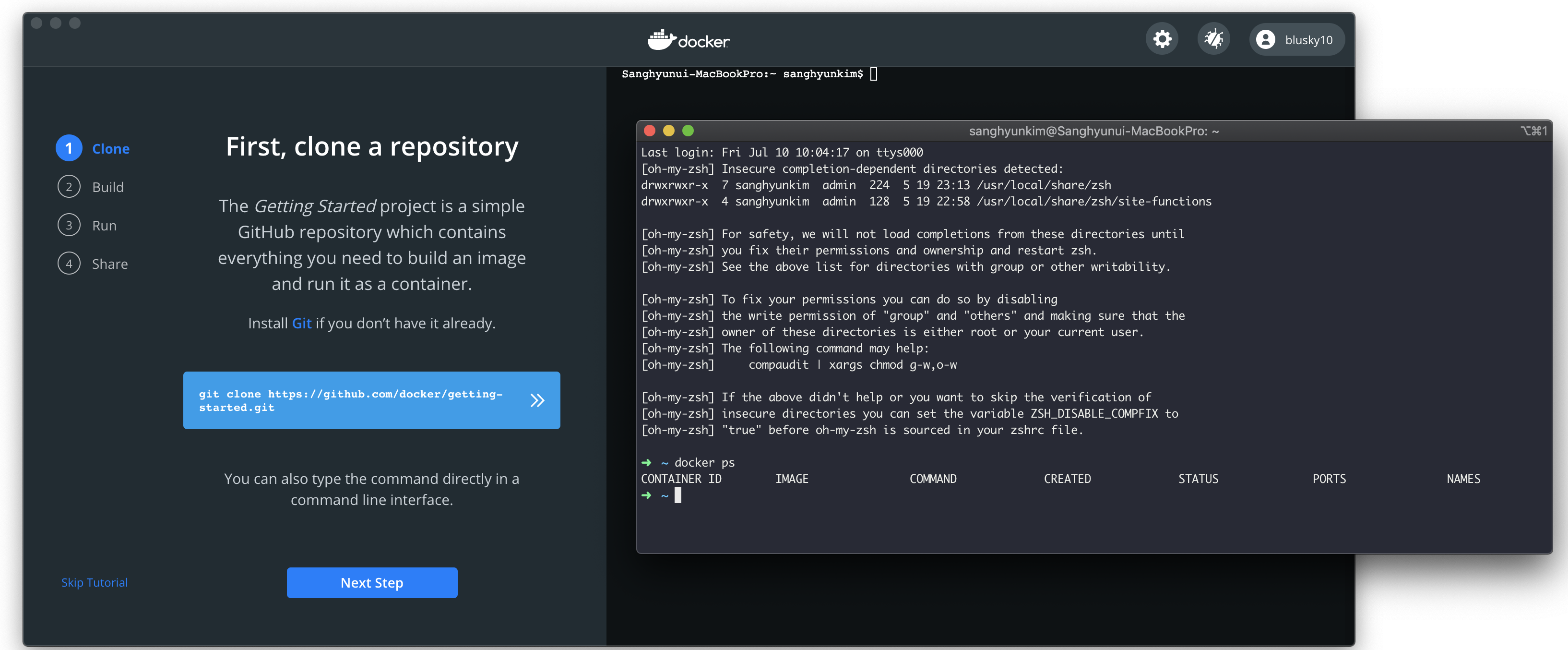 도커를 사용할 수 있는 이런 플랫폼을 사용할 수 있다. 튜토리얼도 할수 있는 창이 따로 있는데 그냥 커맨드 라인에서 명령어를 실행 해도 실행이 되는 상태이다.